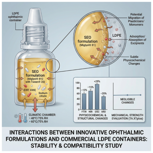 Dokonano przeglądu dostępnych w obrocie opakowań do kropli do oczu (6 typów butelek 5-10 ml oraz tzw. minimsy 0.5-1 ml) i na podstawie tzw. przyspieszonych badań trwałości wytypowano najbardziej optymalną butelkę. W wytypowanym opakowaniu, wykonanym z polietylenu LDPE, prowadzone są dalsze badania trwałości – długoterminowe. Możliwe interakcje preparatu z opakowaniem oceniane będą nie tylko na podstawie analizy chromatograficznej zawartości antybiotyków, ale też na podstawie analizy czystości chromatograficznej preparatu. Poza tym prowadzone są badania fizyczne: wytrzymałości opakowania, tekstury materiału opakowania, charakterystyki spektroskopowej (ATR-FTIR oraz NIR-ATR) i planowane są badania z użyciem dyfrakcji rentgenowskiej oraz szczegółowe badania mikroskopowe. Analiza zostanie wzbogacona oceną stabilności cech reologicznych preparatu i wytrzymałości materiału opakowania, dokonywaną z użyciem analizatora tekstury i reometru, urządzeń aktualnie zakupywanych w ramach projektu.
